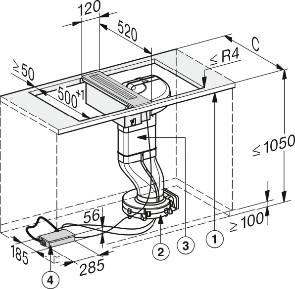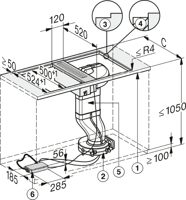 Afmetingen uitsparing in mm (diepte) bij aansluitende inbouw: 500