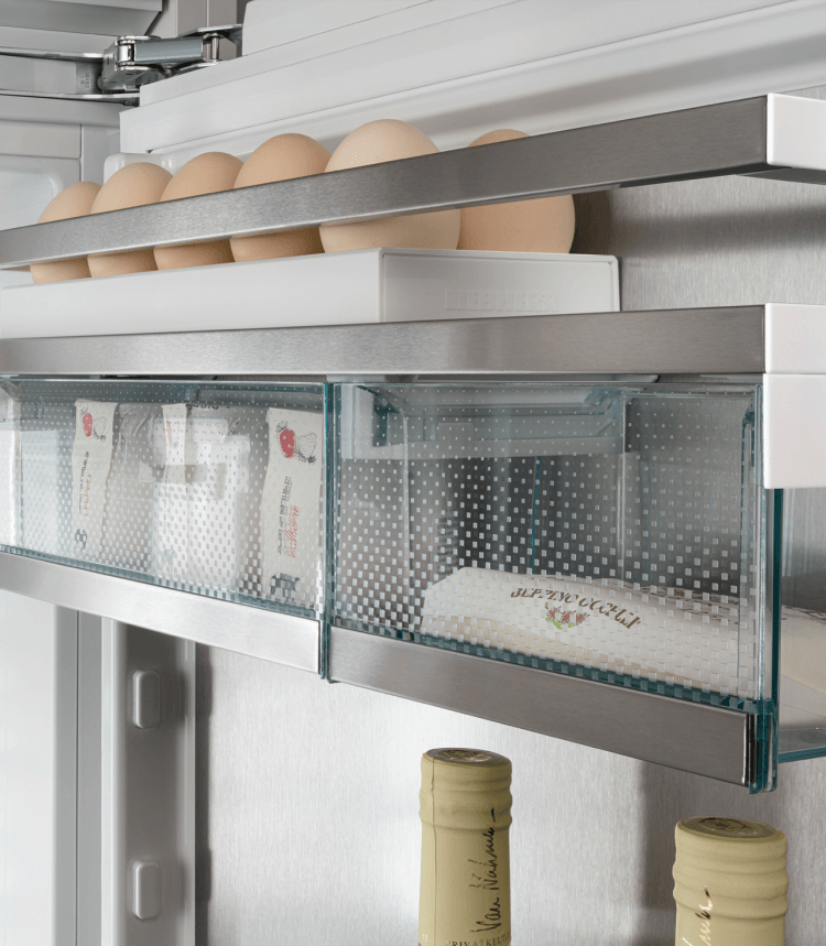 Deurvakken edelstaal & glas met flessenhouder, VarioBoxen uittrekbaar, variabel eierrekje, botervloot