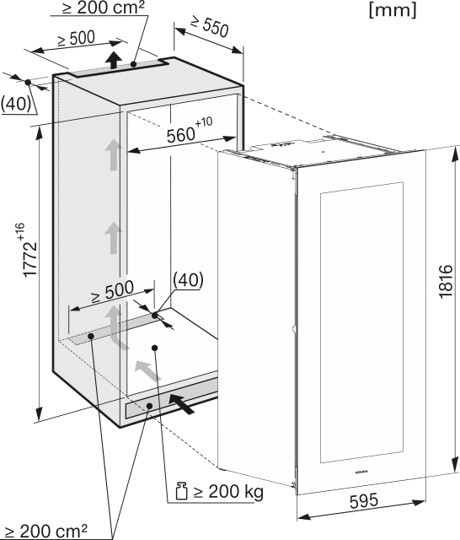 Breedte in mm 595, Hoogte in mm 1770, Diepte in mm 572