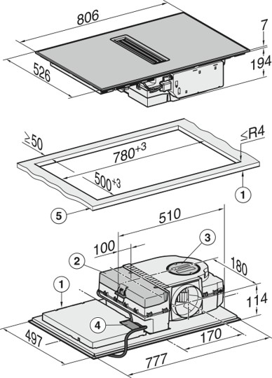 Afmetingen van de uitsparing in mm (breedte) bij inbouw met rand: 780