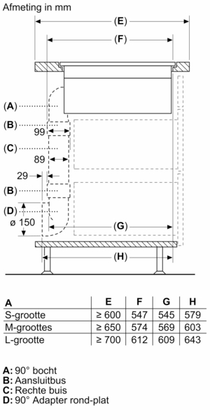 Voor volledig geleide en gedeeltelijk geleide recirculatie zijn de volgende accessoires nodig: HZ9VDKR1 in werkbladen van 60cm diep, HZ9VDKR0 in werkbladen van 70cm diep en HZ9VDKR2 in combinatie met HZ9VDSB3 in werkbladen van 65cm diep