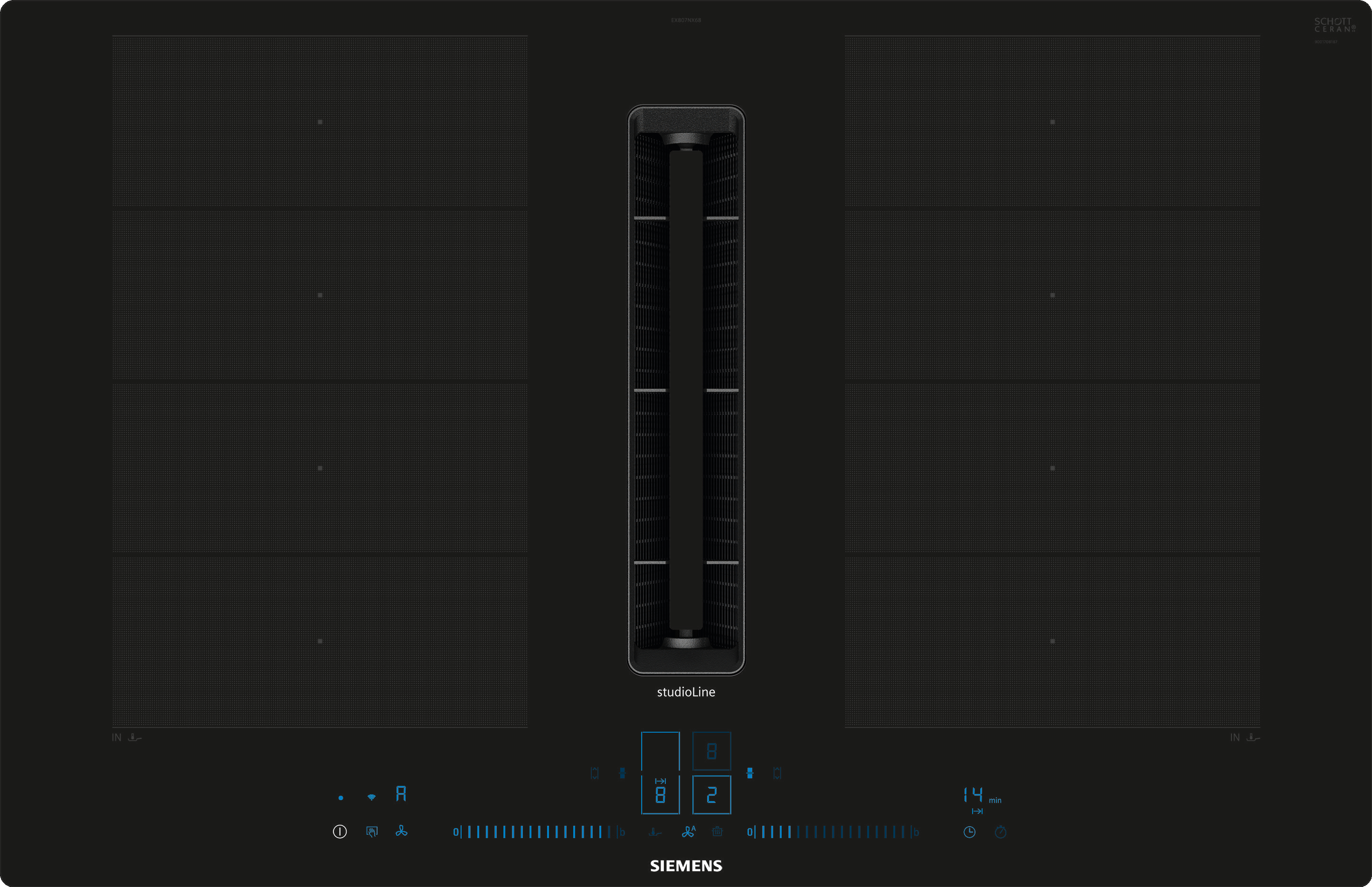Esthetisch geïntegreerd, volledig vlakke luchtinlaat met zwevend, hittebestendig glaskeramiek element voor vrije beweging en plaatsing van kookgerei