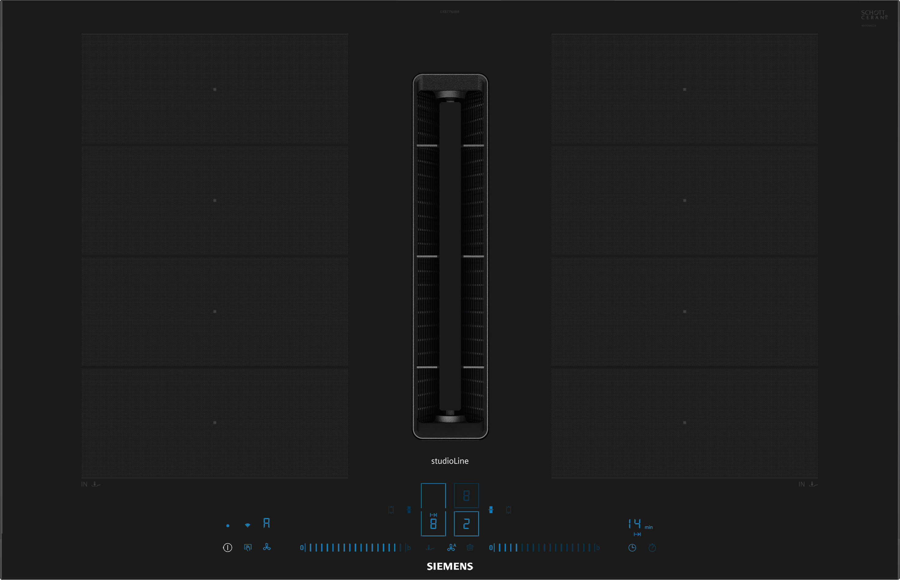 Inductiekookplaat met volledig geïntegreerde krachtige afzuigunit met een keramisch glas element
