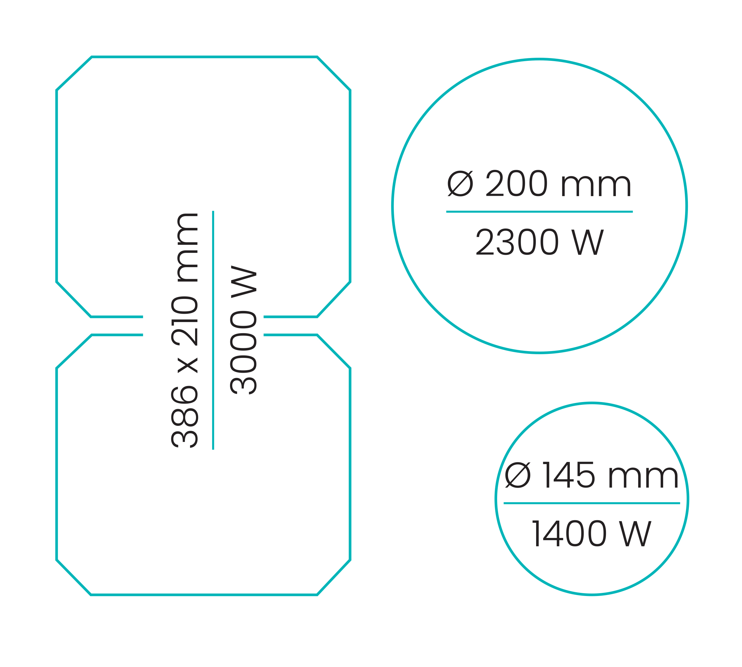 Gekoppelde zones (linksvoor/linksachter) 386 x 210 mm - 3000 W (3700 W)