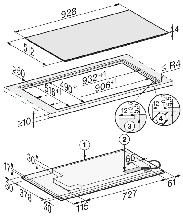 Externe afmetingen uitsparing in mm (breedte) bij strak aansluitende inbouw: 932