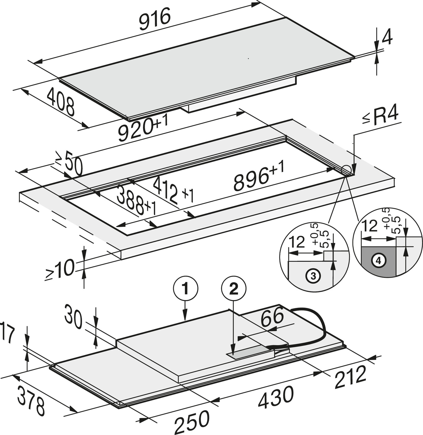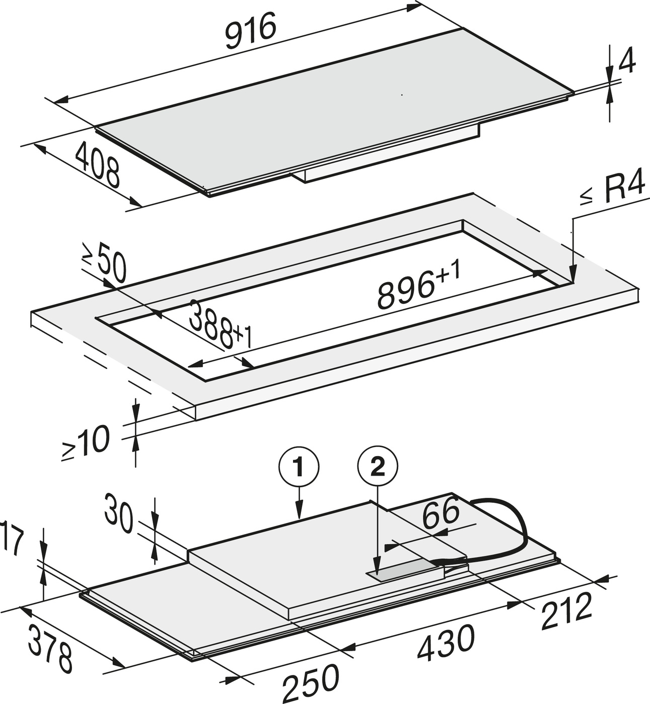 Afmetingen kookplaat in cm 91,6 x 40,8