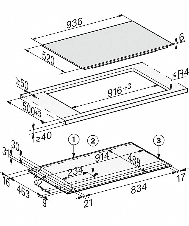Afmetingen van de uitsparing in mm (breedte) bij inbouw met rand: 916