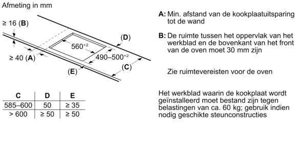 Inbouwmaten (hxbxd mm): 51 x 560 x (490 - 500)