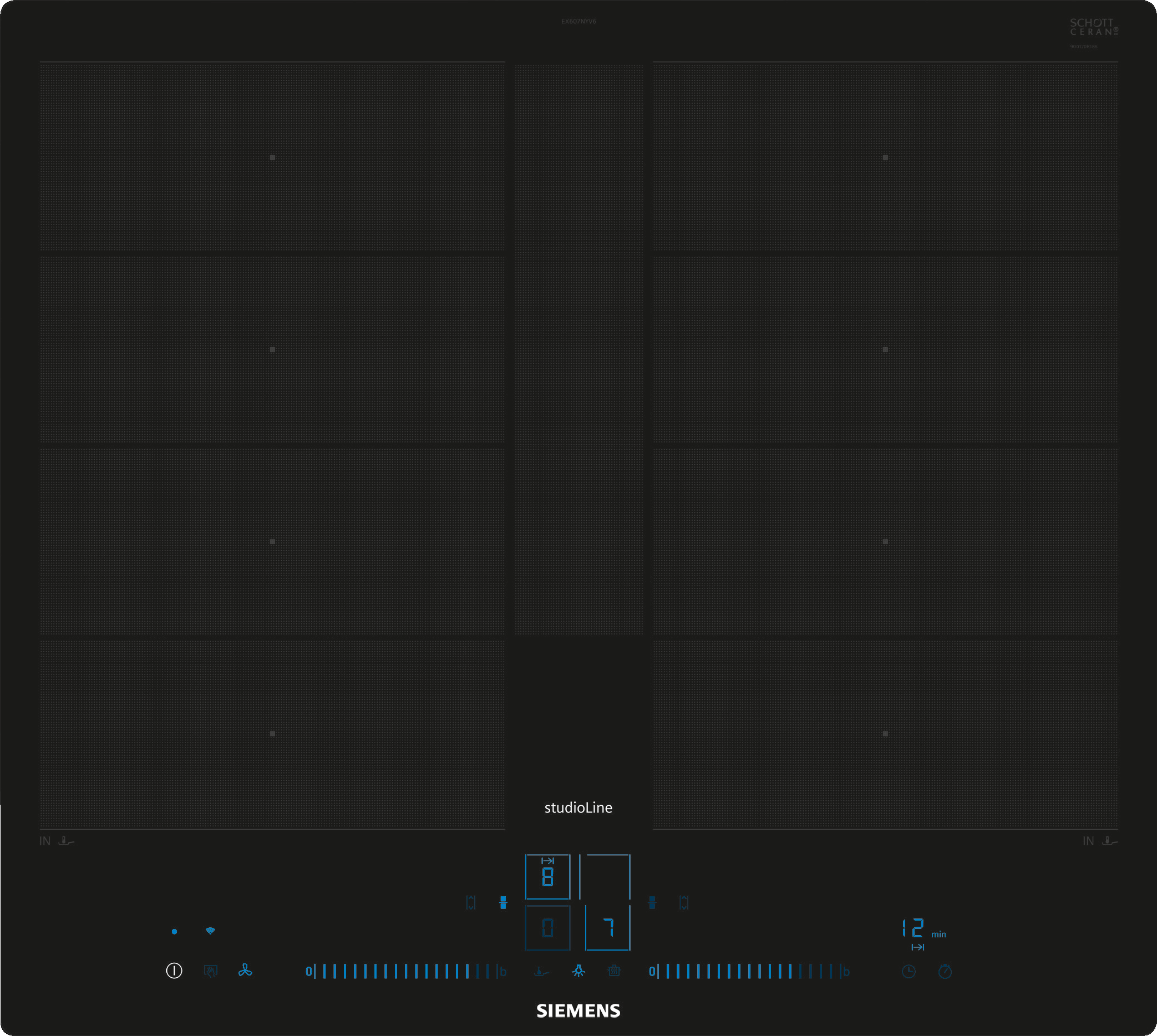 quickStart functie: bij het aanzetten selecteert de kookplaat automatisch de kookzone met kookgerei in (geplaatst in uitmodus)