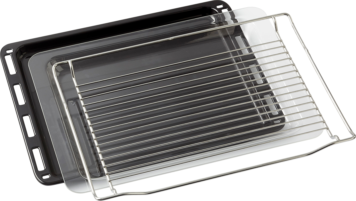 meegeleverd: 1 geëmailleerde bakplaat, 1 diep geëmailleerde bakplaat, 1 glazen bakplaat en 1 grillrooster