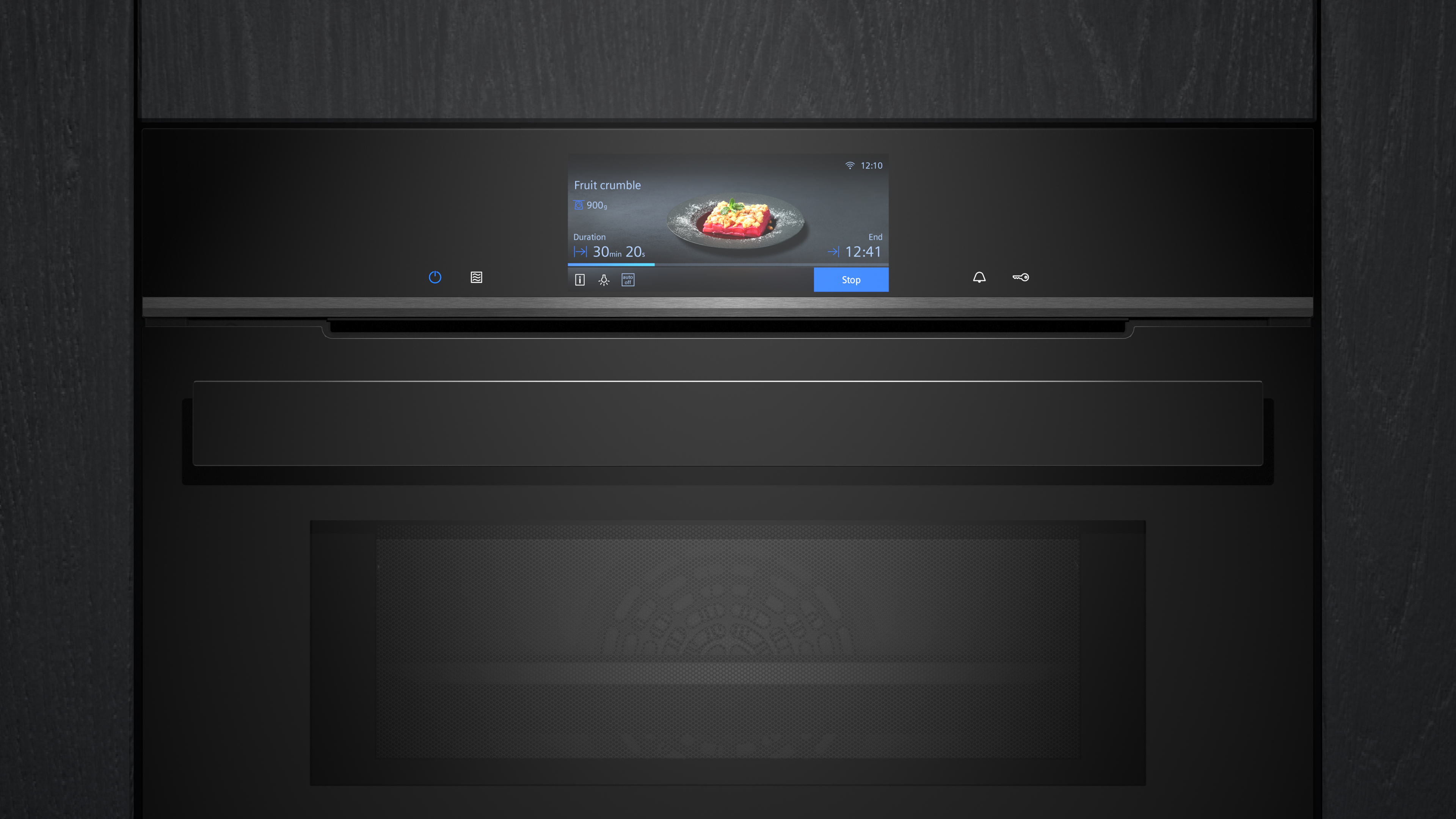Temperatuurvoorstel, Controle van de actuele oventemperatuur, Opwarmingsindicatie, Voorspelling resterende tijd, Kerntemperatuurmeter